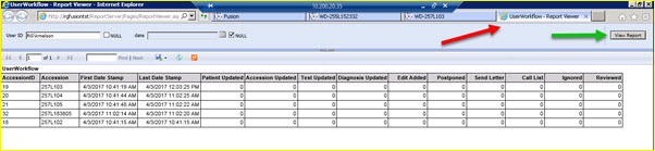 When the workflow link is clicked, a new browser tab, named "UserWorkflow – Report Viewer", is opened to display the report. See the report below and the red arrow showing the browser tab name.