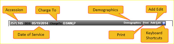 The navigation bar displays the Accession number, Date of Service and ChargeTo information. In addition, the navigation bar provides the functions listed below.