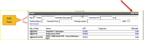 Click on the Add Test link to add a new test to the accession.