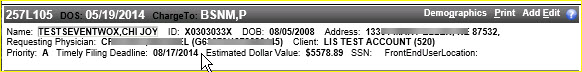 The navigation bar displays the Accession number, Date of Service and ChargeTo information. In addition, the navigation bar provides the functions listed below.