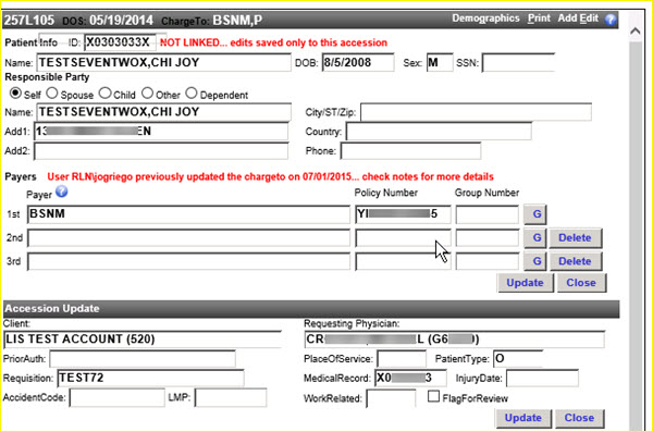 Change patient information as needed in this area. Click the Update button to save the changes you have made.