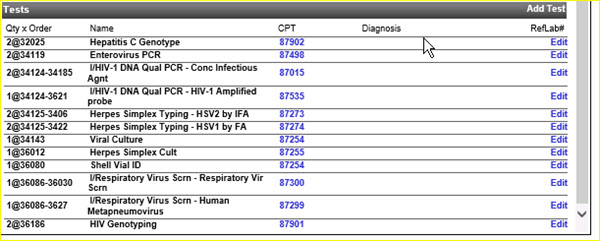 For example, clicking on the Edit link on the 3rd test record, CPT 87015, provides access to the data you may change for that test.