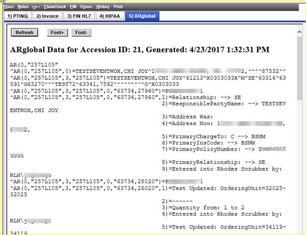 This tab displays an extract of the mumps global data from the FIN billing system for this accession, if any.